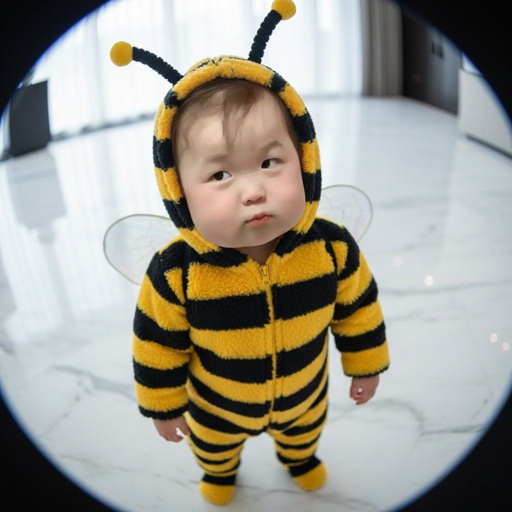 Use uploaded reference for 100% face alignment (preserve eyes, lips, jawline, pores, skin tone, natural hair texture) A close-up photo of a cute baby dressed in a fuzzy yellow and black bee costume with small wings and antennae, standing indoors on a marble floor. The image is taken with a fisheye lens, showing the baby's round face and big eyes looking curiously at the camera. Bright, soft natural lighting. Replace the baby's face with the uploaded baby photo, keeping the same pose, costume, and perspective. Ultra-realistic, 8K, photorealistic texture, smooth skin, vivid colors.