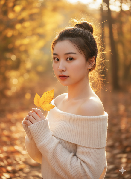 Use uploaded reference for 100% face alignment (preserve eyes, lips, jawline, pores, skin tone, natural hair texture). A young woman holding a golden-orange autumn leaf. She’s wearing a cozy off-shoulder cream sweater, radiating warmth and femininity. The soft afternoon sunlight shines from behind her, creating a beautiful backlight that highlights her hair with a golden glow. The background is filled with autumn leaves in shades of yellow, orange, and brown.