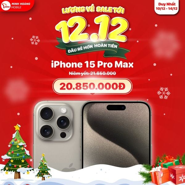 Và đây là thông tin đáng chú ý: từ 10.12 – 14.12, Minh Hoàng Mobile áp dụng chương trình giảm trực tiếp đến 800.000 đồng cho iPhone 15 Pro Max, máy đẹp keng, nguyên zin, giá hơn 20 triệu. Đây là cơ hội hiếm để sở hữu máy flagship ngay trong mùa lễ hội cuối năm, tiết kiệm chi phí nhưng vẫn trải nghiệm thiết bị mới nhất, mạnh mẽ nhất.