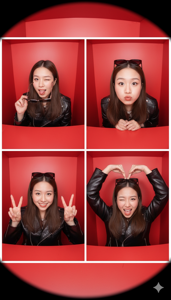 Create image Four-frame photobooth composition inside a small bright red box, captured from a top-down fisheye perspective.