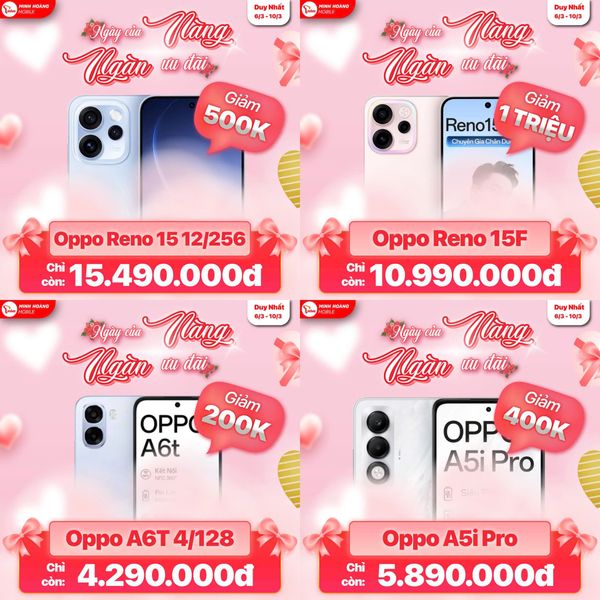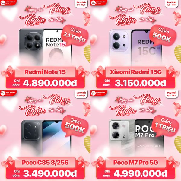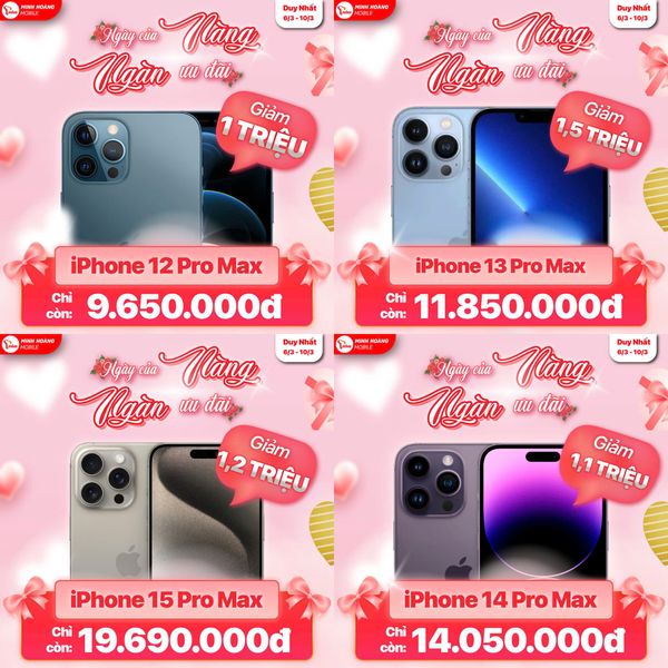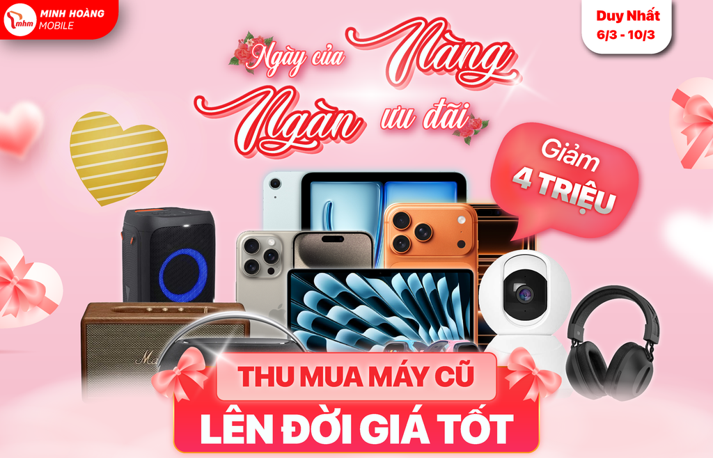 Nhân dịp 8/3, Minh Hoàng Mobile tung loạt ưu đãi cực sâu cho iPhone, Android, laptop và phụ kiện. Đây là thời điểm cực tốt để lên đời điện thoại, mua quà tặng người thương hoặc sắm máy học tập – làm việc với giá cực tốt.