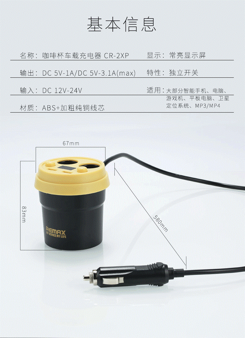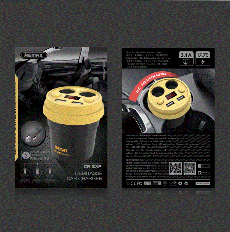 Bộ sạc Oto Remax CR-2XP được sản xuất bởi Remax Hong Kong với công nghệ tiên tiến nhất, đảm bảo từ khâu sản xuất đến các nguyên vật liệu cao cấp, chất lượng, đồ bền bỉ cao. Bộ sạc Oto Remax CR-2XP được phân phối rộng rãi trên toàn thế giới, nay đã có mặt tại Remax Việt Nam.
